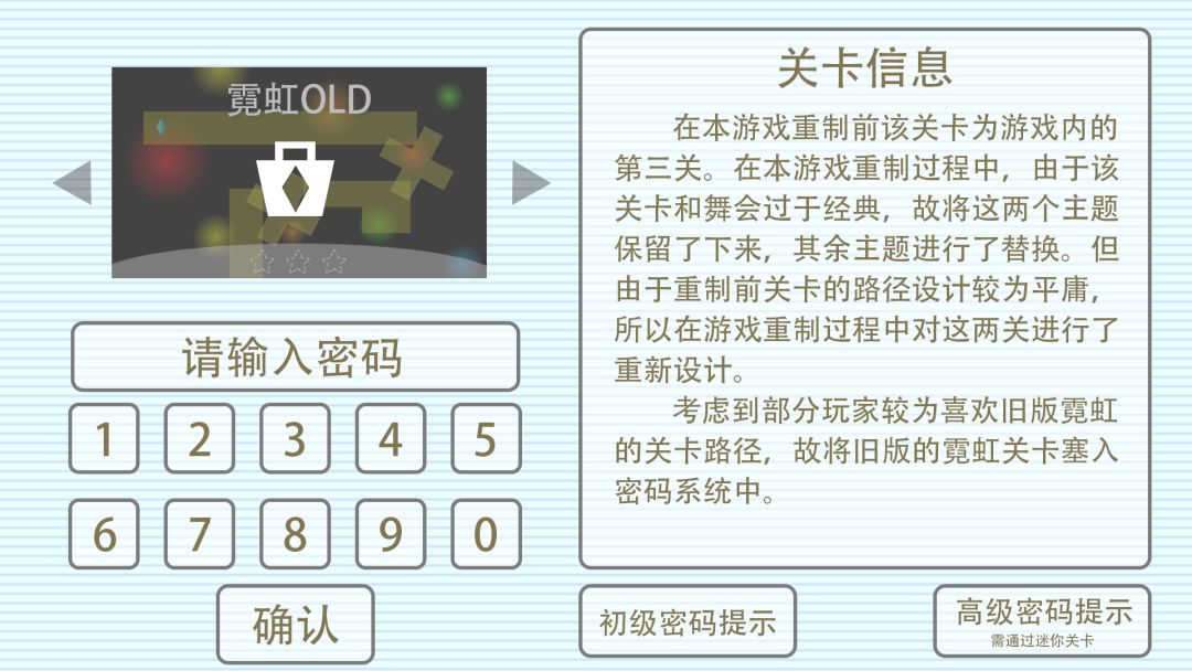密码系统内拥有独立的密码关卡,密码关卡需要输入密码方可解锁(每个密码关卡所需要的密码不同),且不进行难度划分。本次更新将带来第一个密码关卡“霓虹OLD”。