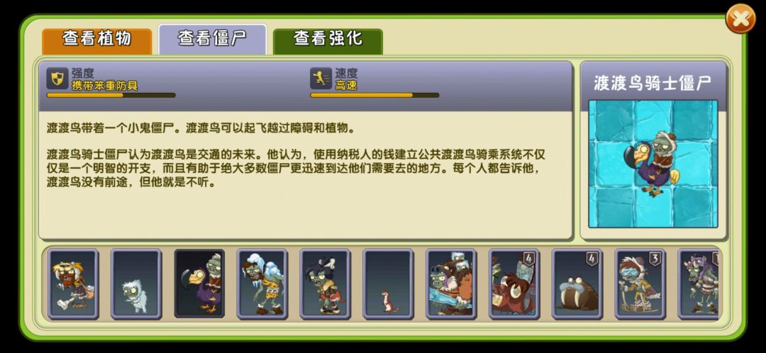 渡渡鸟骑士僵尸,渡渡鸟骑士僵尸每行走一格则会有概率飞起,越过植物的同时向前移动约1-2格。期间可以被三叶草吹走,不会被黄油击杀。