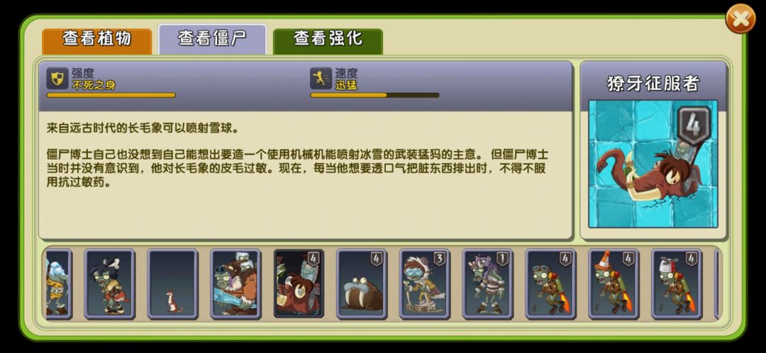 獠牙征服者出场时即覆有一层生命值为1750的冰护甲。冰护甲破碎时,植物才能对獠牙征服者造成伤