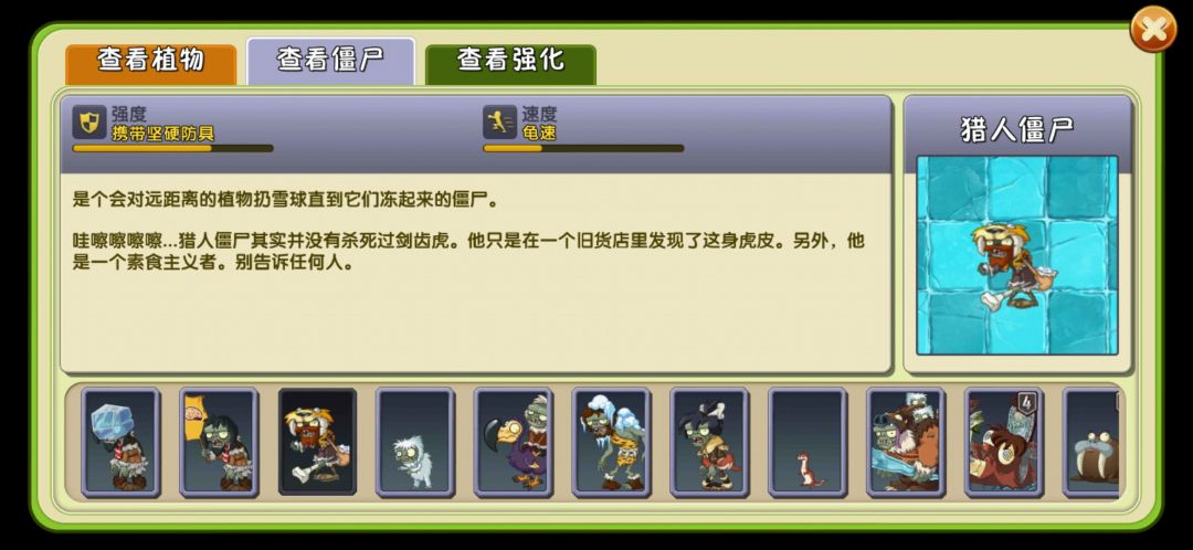 猎人僵尸,猎人僵尸每行走约1格,若自身前方4格内存在非低矮植物,猎人僵尸将会依次投出3枚雪球,每枚雪球都会增