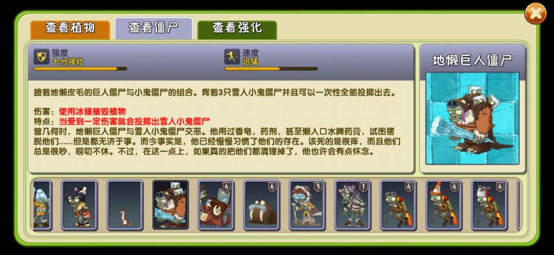 地懒巨人僵尸,当地懒巨人僵尸生命值低于2880,2160和1440(不随阶数变化)时,它将投出一个会落于场内第三列的雪人小鬼僵尸。