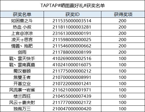 恭喜以下主公获得活动奖励,奖励会在7个工作日内发布到游戏ID邮箱内,请注意查收