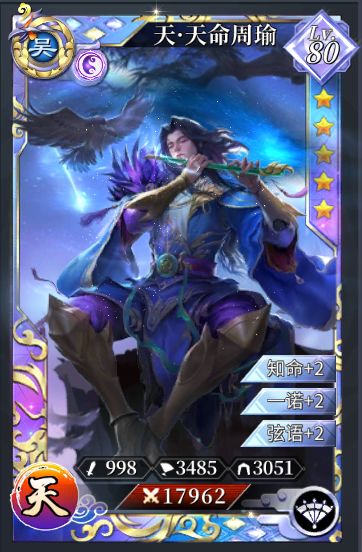 天命周瑜的封侯技能也多加利用了阵容的输出特点和弱化效果。在开场时先手使用时,有极强的抗击爆发能力。且降低主动技消耗的效果使爆发点提前,避免了容易出现战场一轮游的尴尬局面