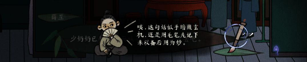 触发与角色/古镜/场景的交互对话,点击对话框右下角的毛笔即可收集。NPC说的每一句话、场景中的每一个信息都可能是线索,只能靠自己分辨,选择有用的证言记录下来。