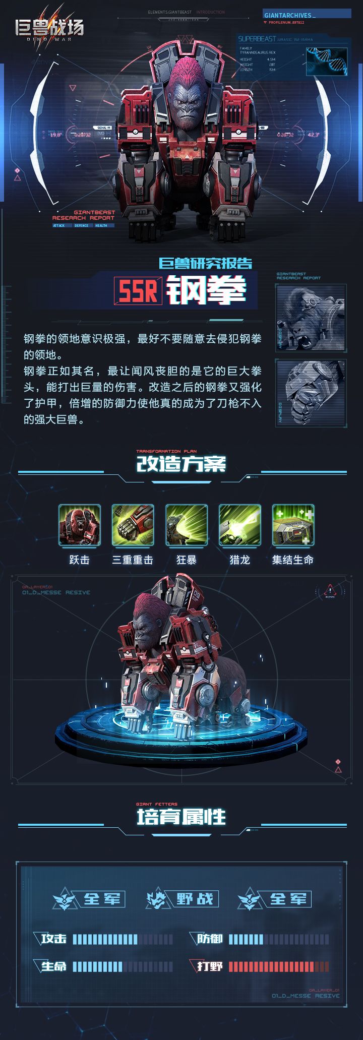 目前针对钢拳的改造,主要成果在于机甲装配对攻击力和防御力的强化,具体报告如下: