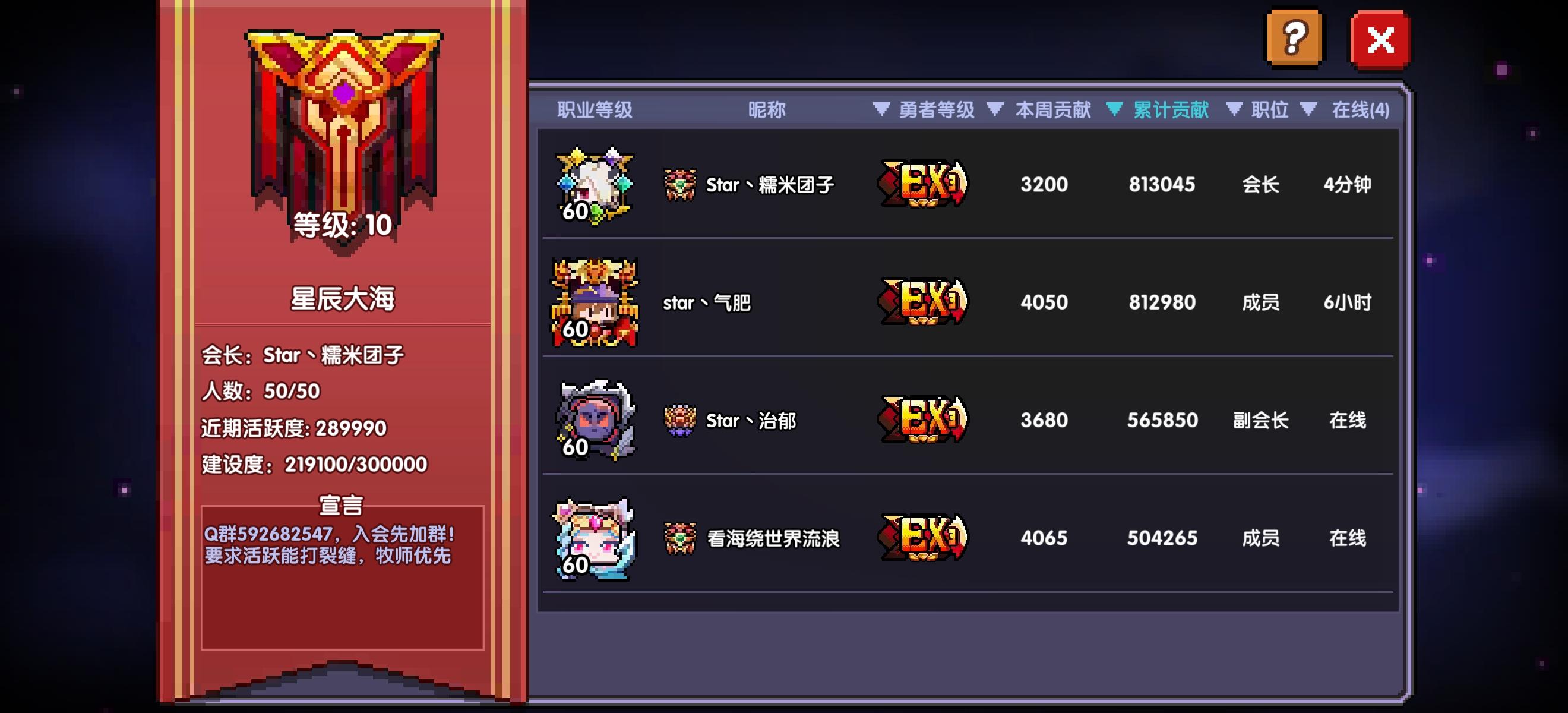为此我还特意开了个11区的号,花了32分钟练到E++,直接搜索公会“星辰大海”果不其然,一个10级公会,由上面的截图可知,该位大佬昵称应该叫做“气肥”