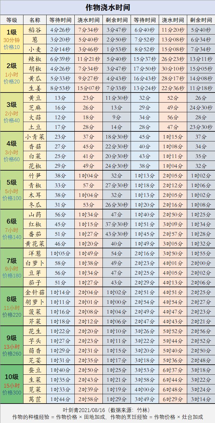 从表格可以看出,没有任何buff和debuff的情况下,种任何食材的经验获取速度,均为一块地一小时获得20经验(不考虑田地等级经验加成)。性价比都是一样的。不是说肝一级就会比别人肝高级速度快,恰恰相反,如果考虑卡点浇水的话,种高级反而会比一级稍微快一点点,快的一点点体现在哪里?体现在高级食物一轮种植只需要浇水两次,同样的时间你肝一级(无论是不是jiaob),浇水的次数越多,浇水浪费的时间越多。