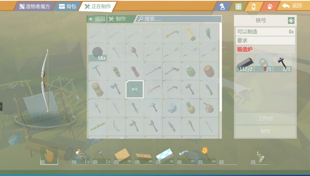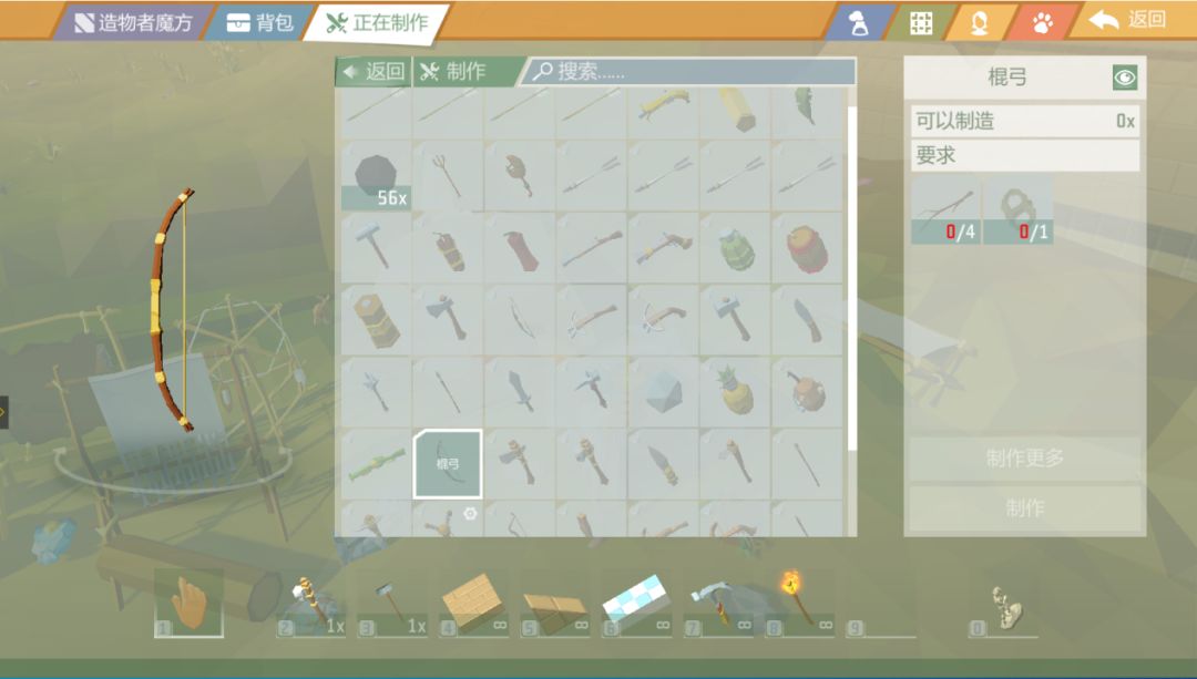 首先是棍弓,所需材料非常简单,木棍x4加任意绳子x1。这个在小伙伴们登岛初期就可以与石锤、石斧一并制作出来。不过初期的棍弓无论外观还是实际使用效果都不如近战武器伤害高,所以,这才有了——铁弓。