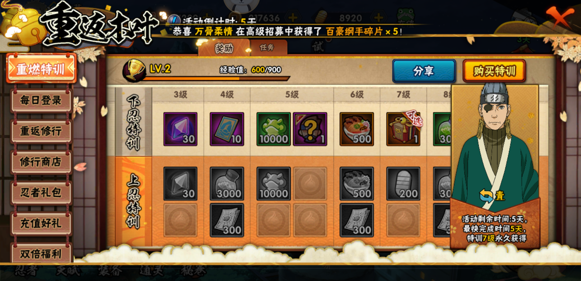 我重返木叶,忍者要特训几级可以拿?如果每天我就做前三个任务,不花金币拿的到吗?