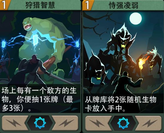 单纯考虑补牌的话,狩猎智慧和恃强凌弱都是相当不错的选择,建议牌组里至少各有一张并对恃强凌弱进行升级(可以从牌组中抽3张随机生物卡)。