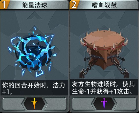 角色装备方面则建议选取能量法球和嗜血战鼓,这两个装备都是卡组中非常需要的。至于其他的角色装备则建议大家根据自身的需求来选取,因为过多的装备会让卡组变厚,在关键时候手上抓了一把装备却没有生物可召唤的时候就非常尴尬了!所以尽量控制住装备卡的抓取,择优选择