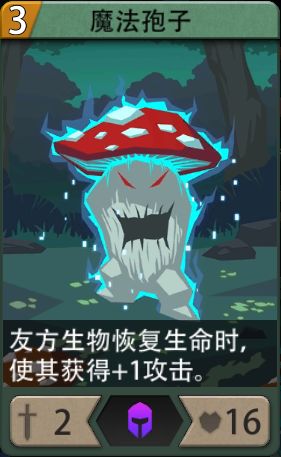 魔法孢子的好伙伴,每回合稳定给全体治疗2点,在拥有多个魔法孢子站场时可以发挥奇效,缺点是费用比较高。