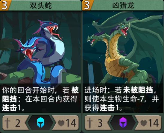 拥有连击的随从在得到加攻效果后,获得的加成也会翻倍,双头蛇和凶猎龙如果碰到了建议可以抓取1-2张。