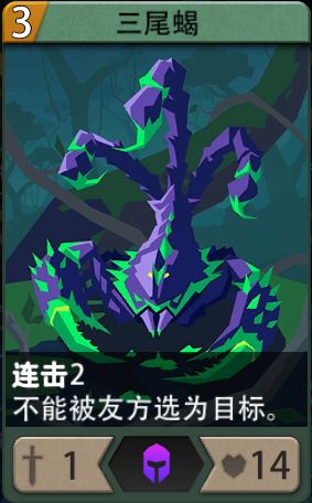 这里提一下三尾蝎虽然拥有连击2(每回合攻击3次),但因为不能被友方选为目标,大部分的法术、生物、装备效果都无法强化它,而它的攻击力只有1点,因此不适合我们的体系使用。