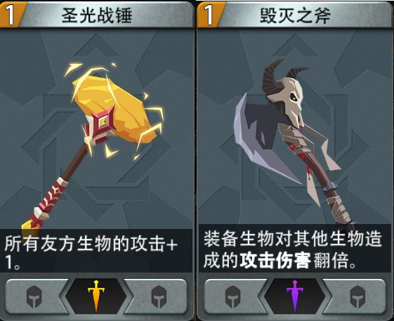圣光战锤可以增加所有友方生物的攻击力,并且只需要1费,也是非常契合我们的战场阵容,基本上属于无脑拿的装备。毁灭之斧可以让你迅速解决敌方生物,直接攻击对手。