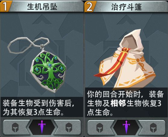 我们的被动加攻需要依靠治疗效果来触发,除了依靠常规的生物效果和法术以外,生物装备也是可选手段。生机吊坠和治疗斗篷都能各自为我方生物带来稳定的治疗效果。