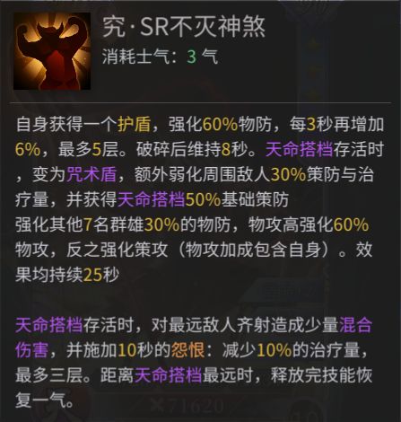 天命吕布的封侯技能弥补之前对后排核心缺少有效防护的问题,同时也让吕布重新成为版本最肉的武将之一。同时自身也担负起部分的有效输出,使队伍的输出结构变为物法混伤