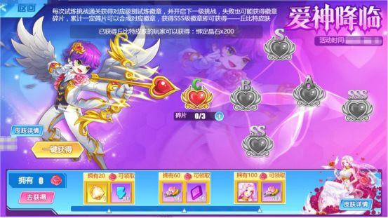 为爱而战,通过爱神的SSS级爱情试炼考验,即可获得R英雄丘比特皮肤--一箭倾心