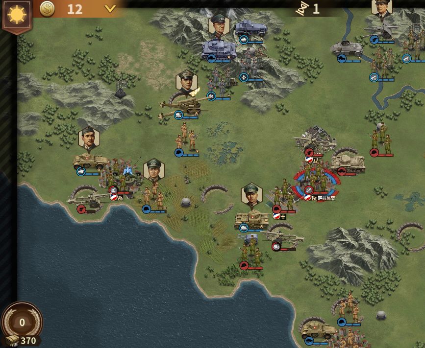 首先一张开局图,是后面重截的,有很多可以凹的点,比如巴炮秒掉装甲车然后连击啊,古德闪电秒编连击啊,梅赛秒掉火炮啊。补给我买了2船(能买了就买,快点到前线),重坦(能买了就买,离前线越近越好),然后因为我之前的关没完美,只够买一艘轰炸机了,帮着后面空降。