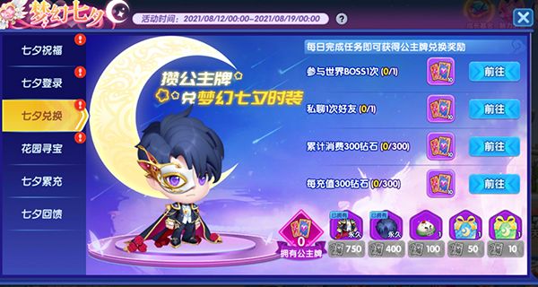 活动时间内,完成任务获得公主牌免费兑换梦幻七夕时装。