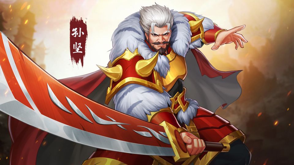 在游戏内,孙坚为S级武将,属于战士型类型,以技能和连击见长的武将。其四个技能分别为:狂怒反冲、横剑顺斩、剑刃风暴、剑定江山,下面进行技能的详细分析: