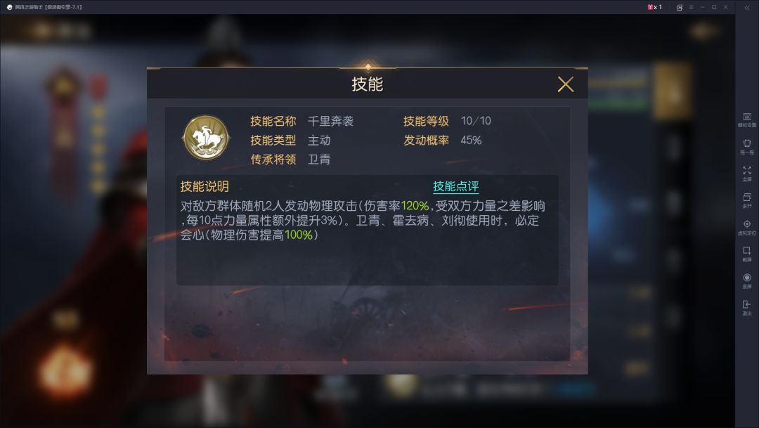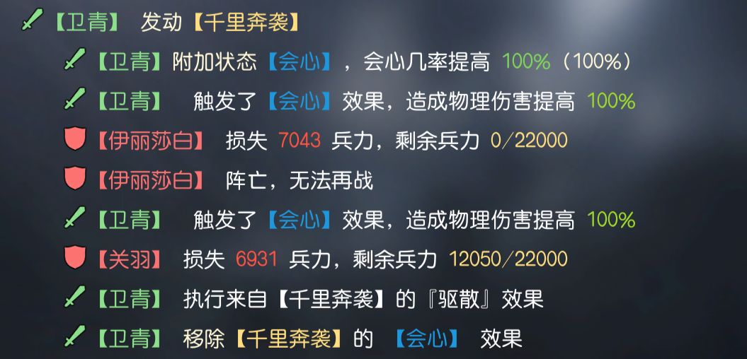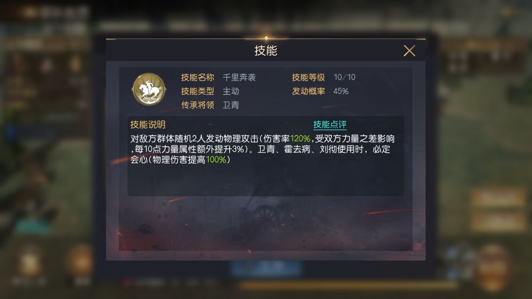 由于卫青在战斗中会获得极高的力量增幅,所以他的技能主要围绕力量值搭建,推荐千里奔袭+霸王扛鼎,霸王扛鼎再次提升卫青的力量属性,并在战斗中每回合触发1次单体伤害。千里奔袭则根据敌我力量差距打额外伤害,并且卫青使用时必定触发会心。
