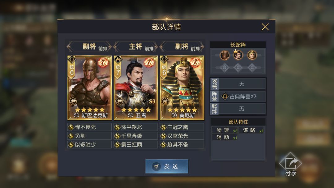 队伍中卫青自带技能荡平朔北可以在造成伤害的同时给己方增加力量,非常适合配合有力量增强效果的将领。而千里奔袭可以极大的从力量属性中受益,属于卫青的必备技能。另一名将领建议选择比较吃主动系的斯巴达克斯,双核均有极高的爆发能力,且无需准备回合。
