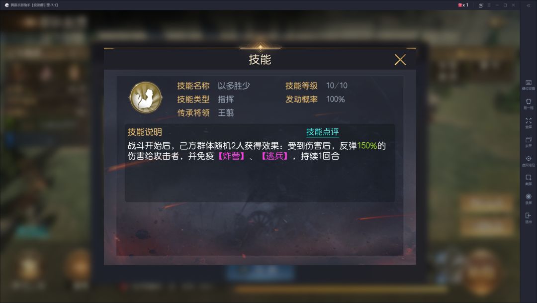 另一个技能推荐以多胜少,该技能为新赛季技能,能在首回合反弹伤害并免疫炸营与逃兵。防止负荆与霸王扛鼎失效,同时可绝对反制菜刀队伍,也能减少队伍在防御上的压力,不过这样的打法战损会比较高。