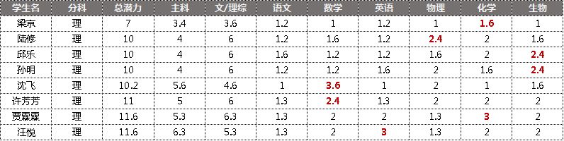 为了解决这个问题,我统计了各档次学生的所有数据,其中,标红色的为学生兴趣科目。