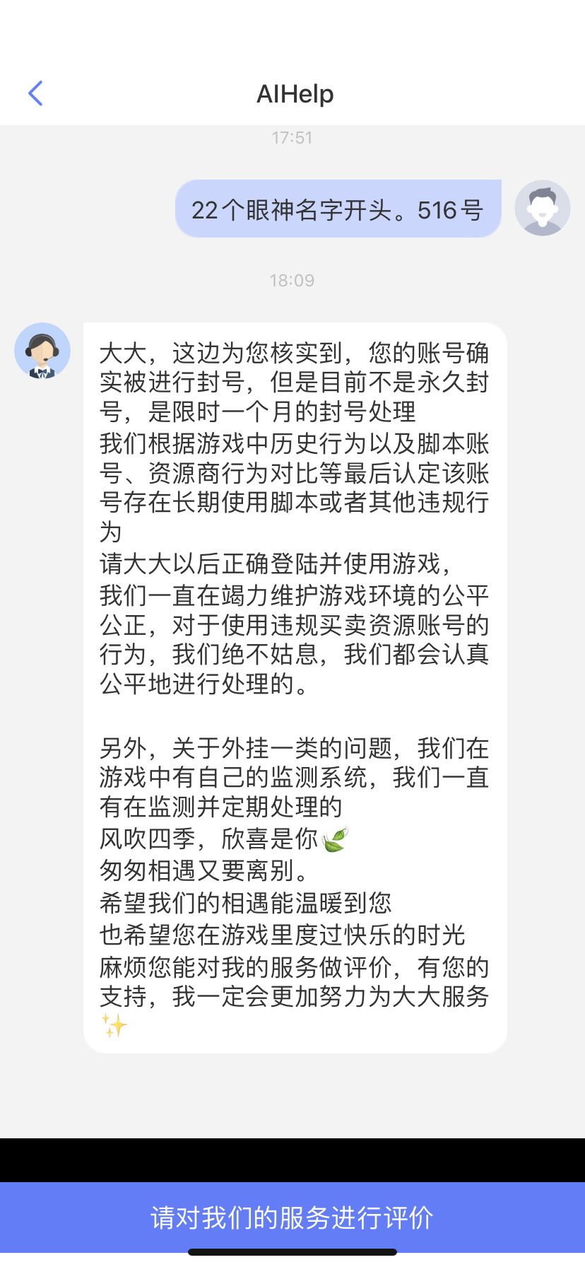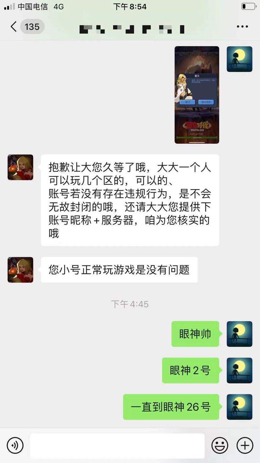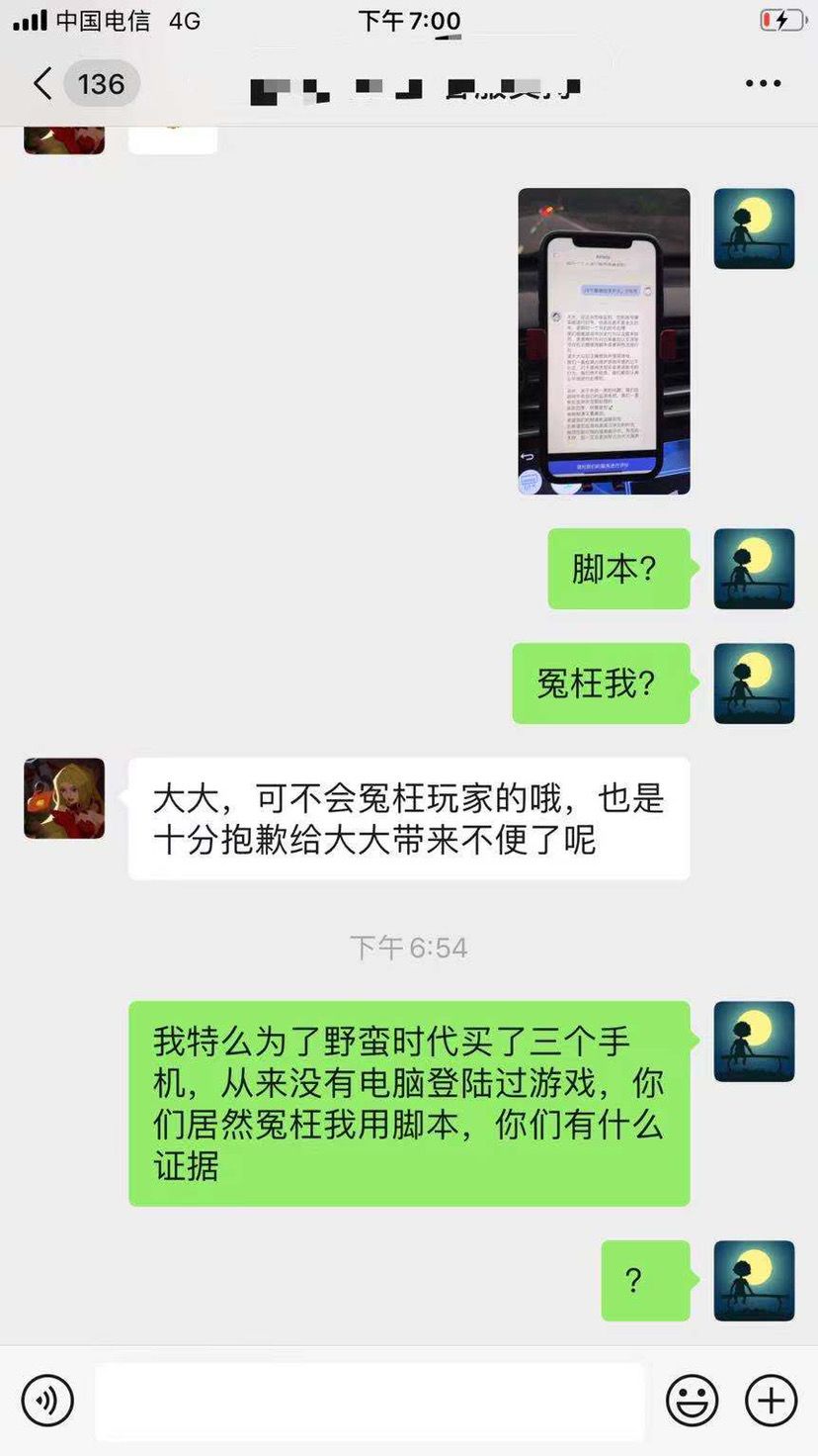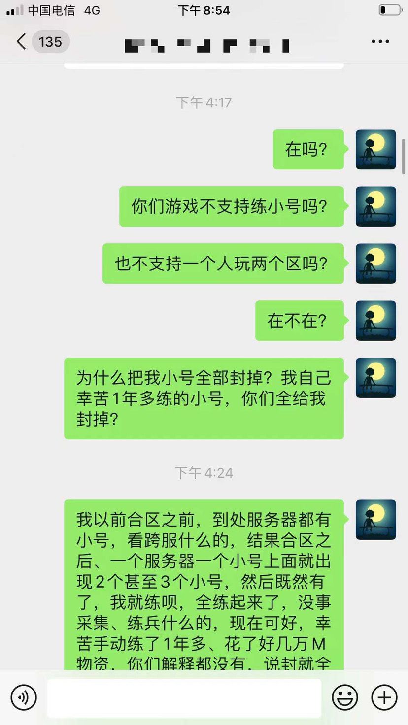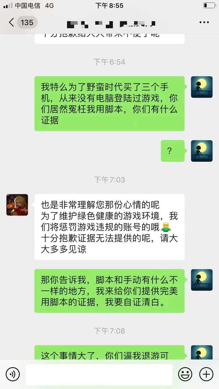 大家好,不是忍无可忍,我真的不想把这事发到这里上面来,我是516服务器的一名玩家,游戏ID叫做眼神,大部分人都知道游戏里面练小号的作用,可以采集物资、召唤蘑菇、练兵赠送联盟币,作为一个游戏玩了4年的老鸟,我也是如果做的,做之前,我反复和客服确认过,只要不是用脚本,这些行为都没有违反游戏规则,在规则以内的,那么我也这么做了,做了比其他人还极致,我练了23个小号,花了上万M物资、近半年时间才完成的,到了享受成果时候,我没有自私自利的为了让自己一个人享受,而是为了车头天赋等级,送车头、每天固定时间点,让全区所有人来采集,每天形成一小波人工蘑菇雨,结果呢?今天被三叉戟实力冤枉,说我长期使用脚本,真的让人愤怒的同时让人也哭笑不得!我让三叉戟提供我使用脚本证据,他们不提供,我为了自证清白,提供证据我没有使用脚本,他们对我爱答不理,不是忍无可忍,真的不想把事情发到这里,下面是我与客服之间对话,和一些证明,证明我平时我不怎么采集,物资都是霜火类任务得的物资和找朋友要的物资,另外朋友之间聊天,证明我手动练兵,我从来没有电脑登录过,小号物资几乎都是安全物资,除了霜火多了不少肉,其他都没有运费过大号,这些还不能证明我的清白吗?