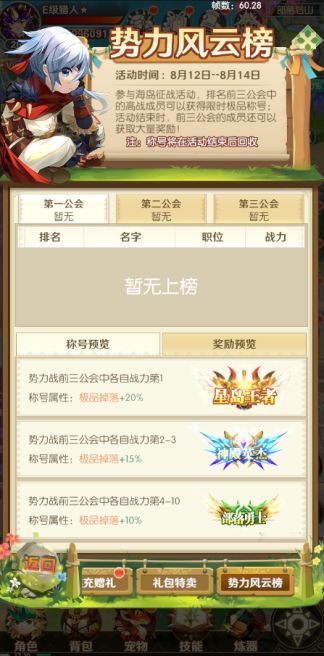 公会的排名根据对应天数的开服海岛积分进行排名,排名前三的公会中,每个公会战力前十的玩家可以获得限时称号!