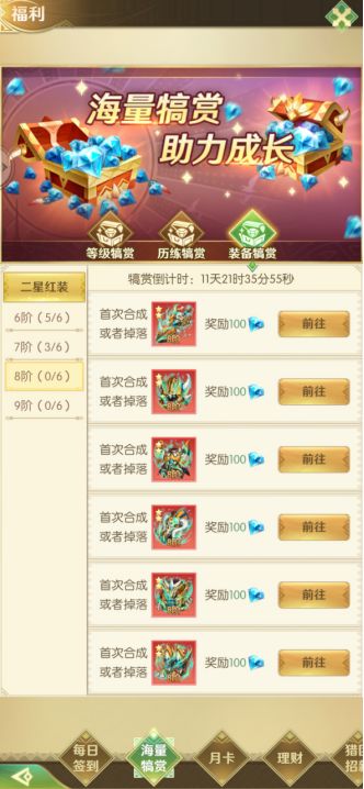 角色到达指定等级时,将获得丰厚的等级奖励,高阶极品装备,升级免费送!