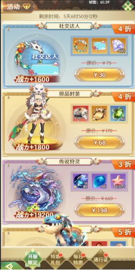 超值特惠礼包打折送,购买礼包还可获得兑换道具,兑换万能ssr宠物进化、极品法阵、豪华时装等其他资源。