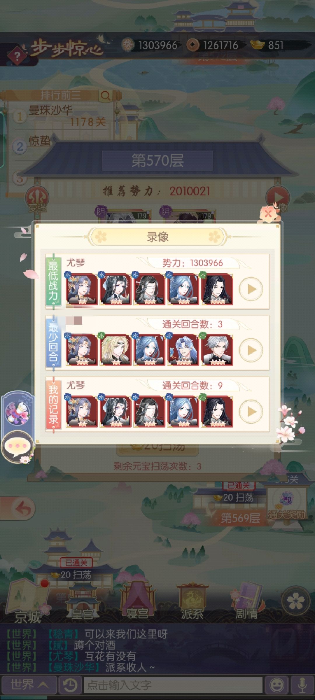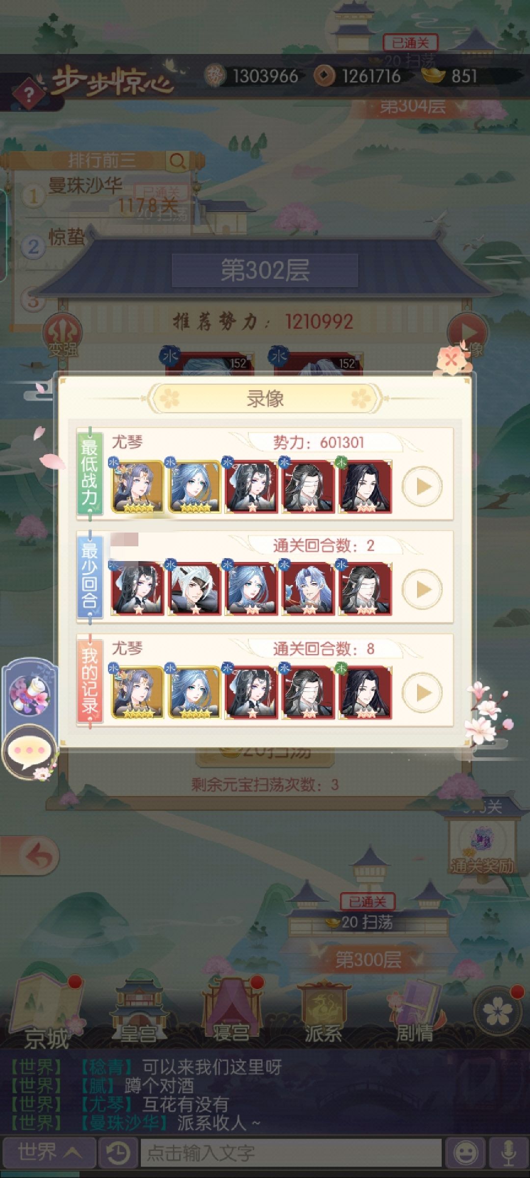 下面是阵容的效果:如图234可以看到,我在势力排名近60的情况下,剧情和步步惊心一直是排在30不到的排名,130w的战力过到了41-17的主线,可以说逃了很多练度了😚;图56是步步惊心,很多关点开录像最低战力都是我😉