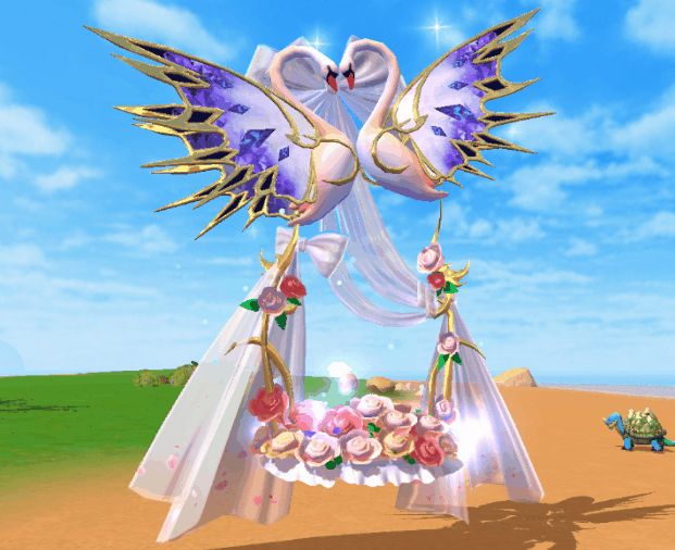 “心心相印,白头偕老。” 双人载具心心相印秋千上方两只天鹅额间相抵,半透明的轻纱在后方系成蝴蝶结,座椅与吊藤上用粉红色玫瑰花做点缀,处处彰显着浪漫与美好。大家可以邀人共乘,在七夕这个特殊的日子里,与TA一同穿梭在贝雅大陆!