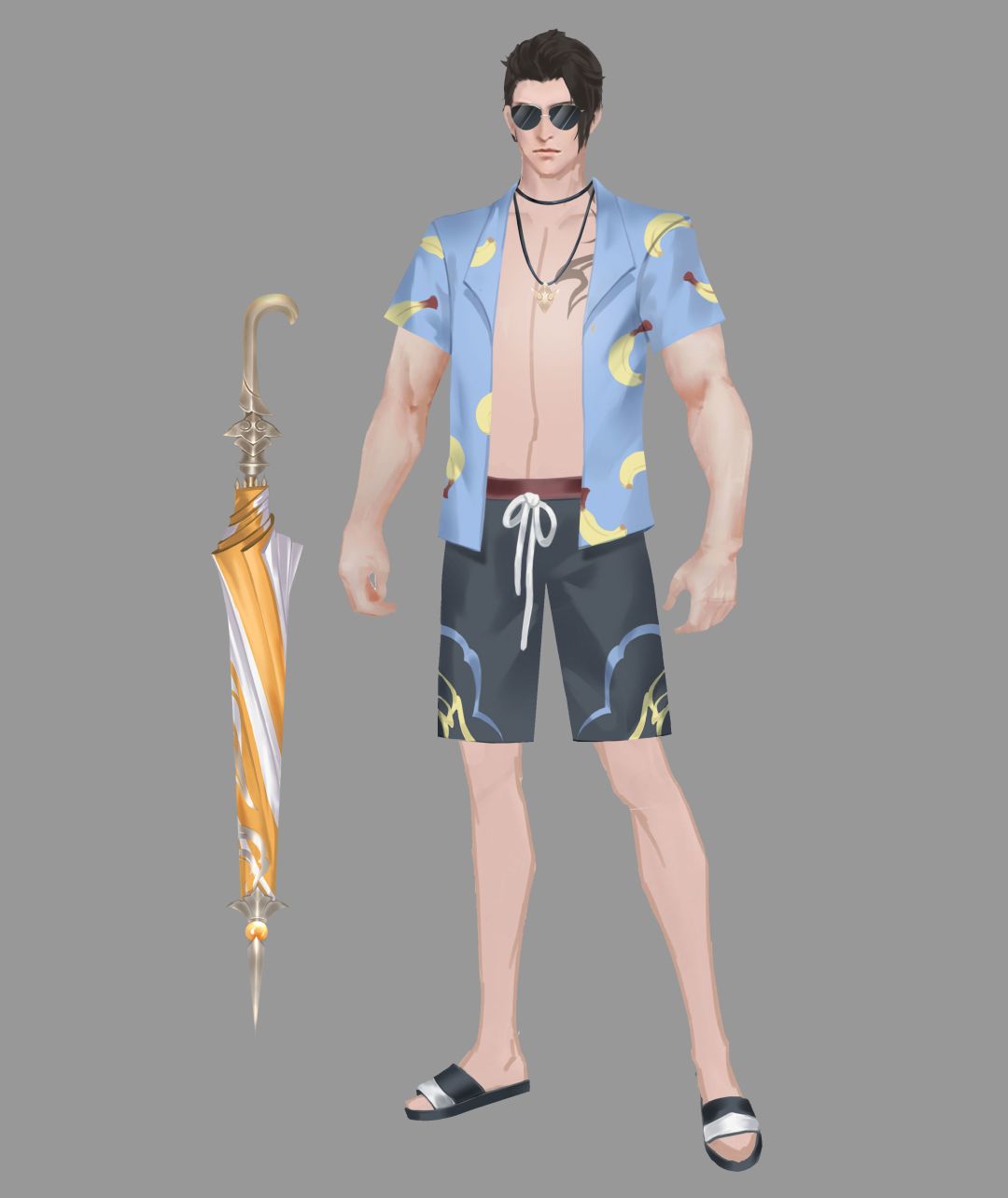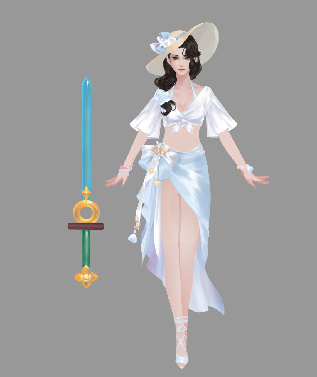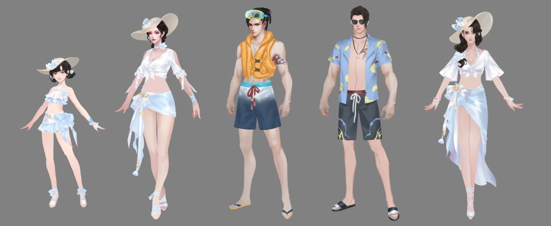 炎炎夏日,穿上一套冰冰凉凉的服饰,解暑又养眼!清爽的蓝色和白色是衣服的主色调,夏季感爆棚!给3位女性角色都搭配了一个太阳帽,可不能把我们的小美女晒到,给沉稳的公子哥南宫搭配了一个墨镜、活泼好动的一剑搭配一个泳镜方便下水嗨玩儿!