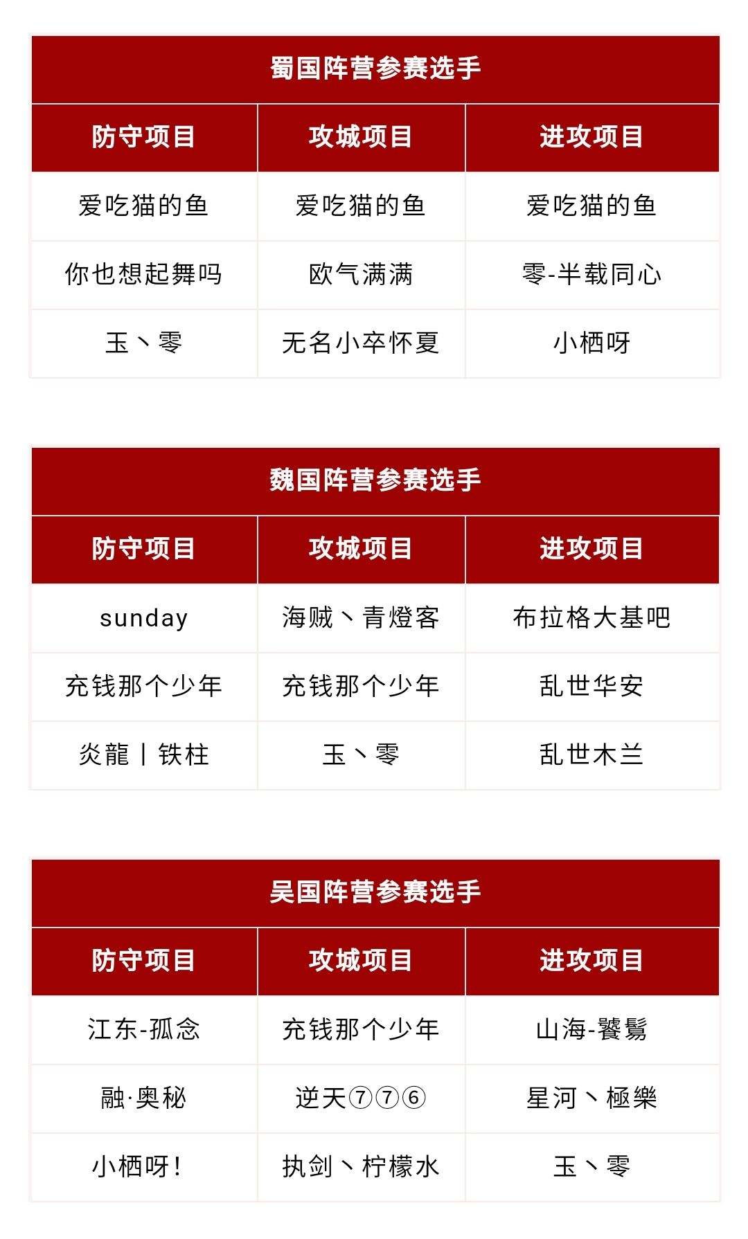 本次参赛名单入选条件为点赞排名与发布时间,当项目队伍满额时,小图将停止招募。由于入选参赛的队伍共有27个,其中部分队伍源于同一名主公搭配,所以小图在这里特别提醒各位,同一ID可参加所有项目,但仅可获奖一次,取最高等级奖励!
