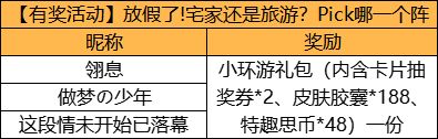 在评论区回复有了假期,宅家你会想干什么/旅行你会想去哪里即可参与活动,我们将从回复玩家里抽取10位送出小环游礼包(内含卡片抽奖券*2、皮肤胶囊*188、特趣思币*48)一份哦~