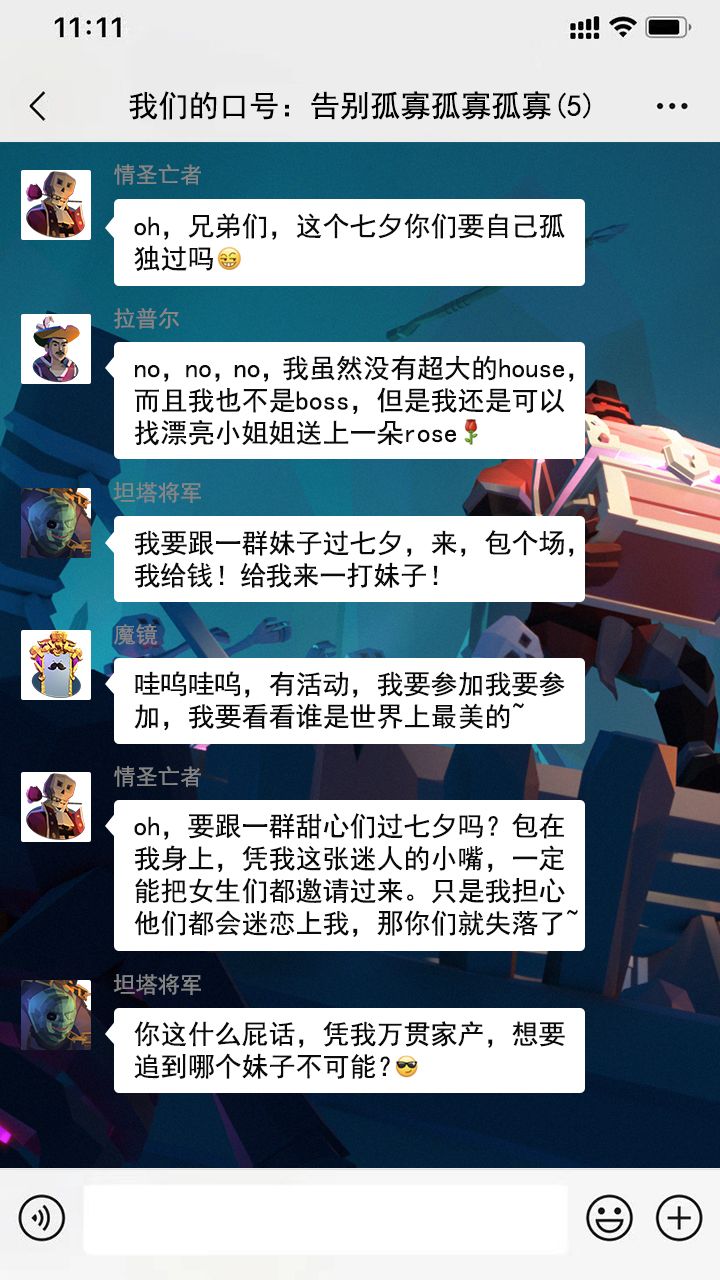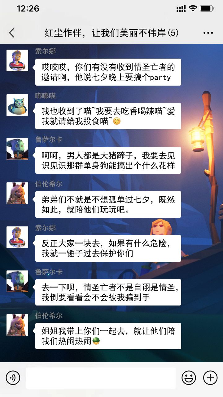 以上就是工具人我,冒着巨大的生命危险,潜伏各个群里获取到的聊天。这个七夕的夜晚,村口酒吧一定异常精彩,究竟会发生什么有趣的故事呢?这就要靠各位寻宝者们脑洞大开,给他们续写一段七夕花前月下的爱恨情仇了!