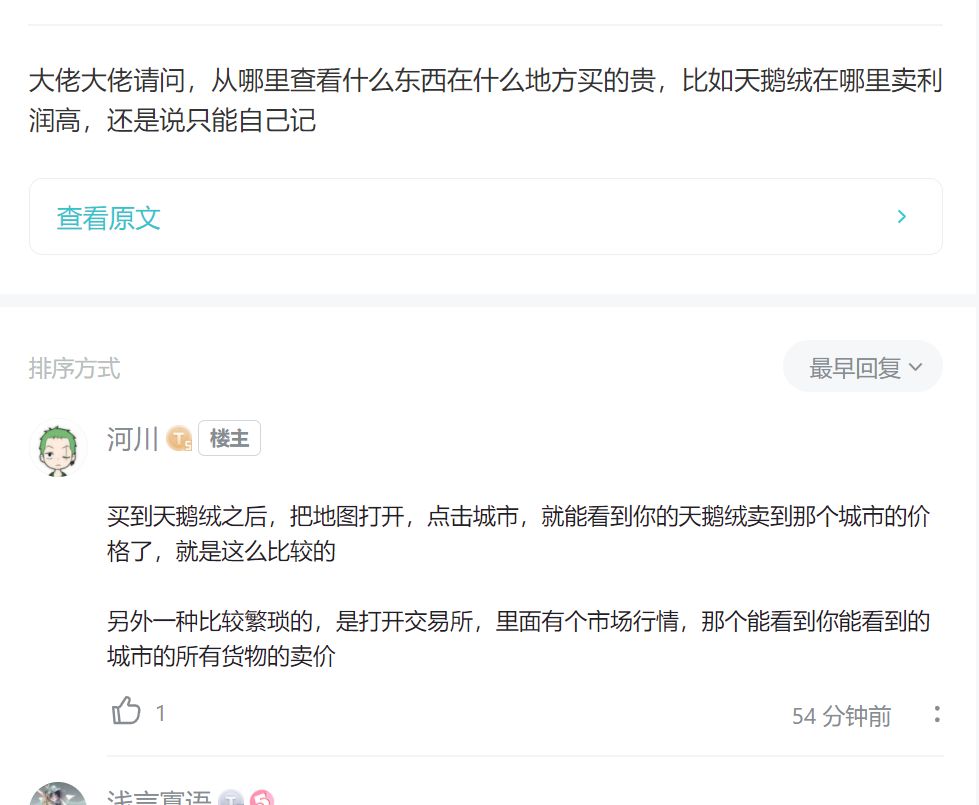 Emmm这个问题其实无法回答,因为对于每一种货物,每个城市都有不同的基础价格和波动价格,所以当你开局(开局一定跑的是近港,近港就意味着大部分城市的基础价格差不多,主要价格差距就在波动价格上)跑商的时候,需要做的就是,买到一个城市的货物后(开局仓位比较少的话,尽量买卖那些单价更高的商品),点开地图,看下你能看到的所有城市里,哪个城市的卖价最高,然后卖到那里就行了。