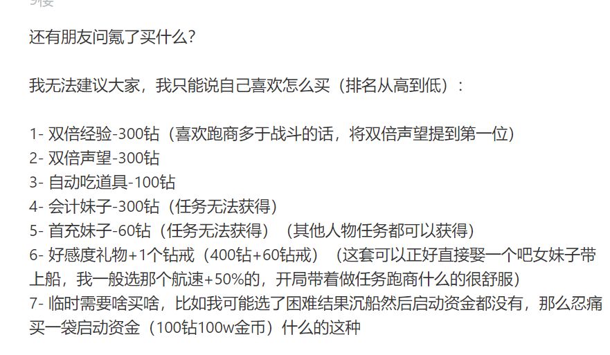 两个双倍、便携道具,月卡,蕾西亚,颜思齐,一个吧女妹子(买40元的礼物和一个钻戒,娶一个吧女,我喜欢塞维利亚的那个,能加航速)