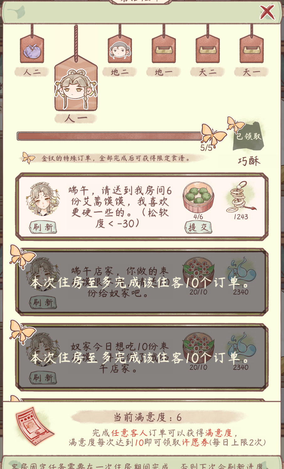 金衩的客房任务:一共50份枣花馍,每单10份(不要求属性),房间不挑,食谱为巧酥。