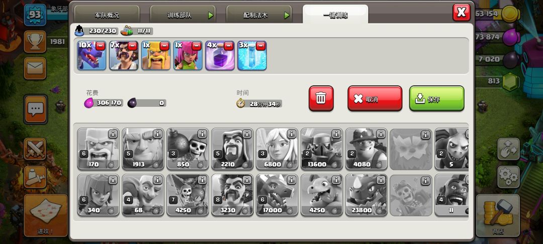 由于我之前花了一个月从8本速到11本所以科技防御没得说,我只能专攻狗球,但是升级的资源不够啊,于是。。。。