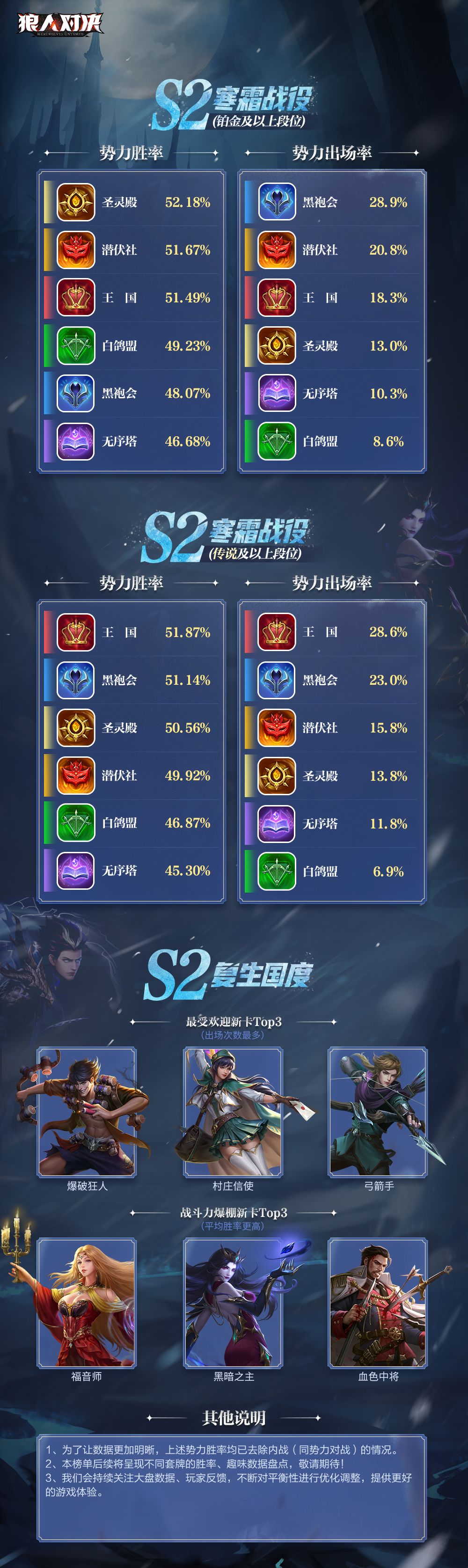 传说及以上:王国拿下了第一的位置。黑袍会占据第二,相比他在S1的表现,以及铂金及以上段位胜率有所提高。白鸽盟、无序塔胜率较低。