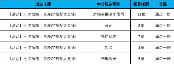 获得本次“七夕情缘,浪漫CP搭配大竞猜!”活动的奖励,获得官方精美游戏周边一份请五位创造师主动48小时内联系加QQ群881796696,咨询客服进行登记兑奖哈我们每周都有各种各样的互动活动哈,请各位创造师保持关注,积极参与吧!