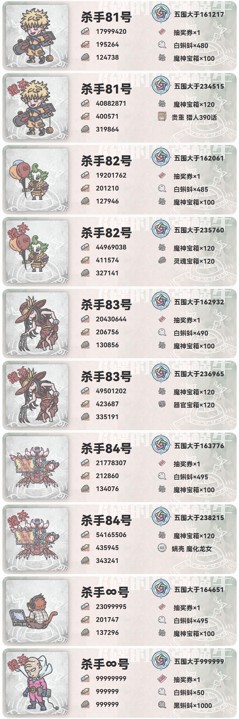 本次共更新了15位杀手,显然是为奆佬准备的。虽然嘴上总说“看着就好”,但好歹让普通玩家有了目标和前进方向。