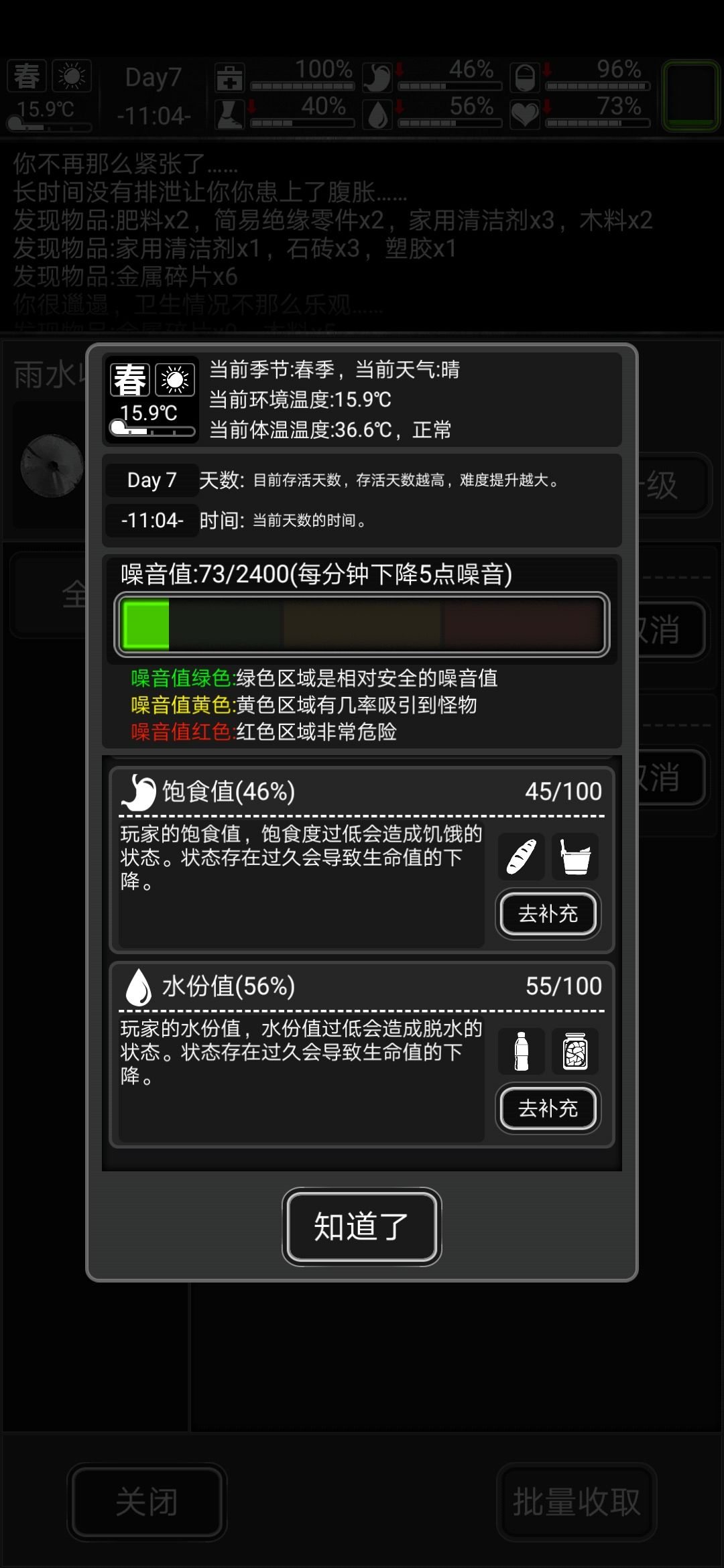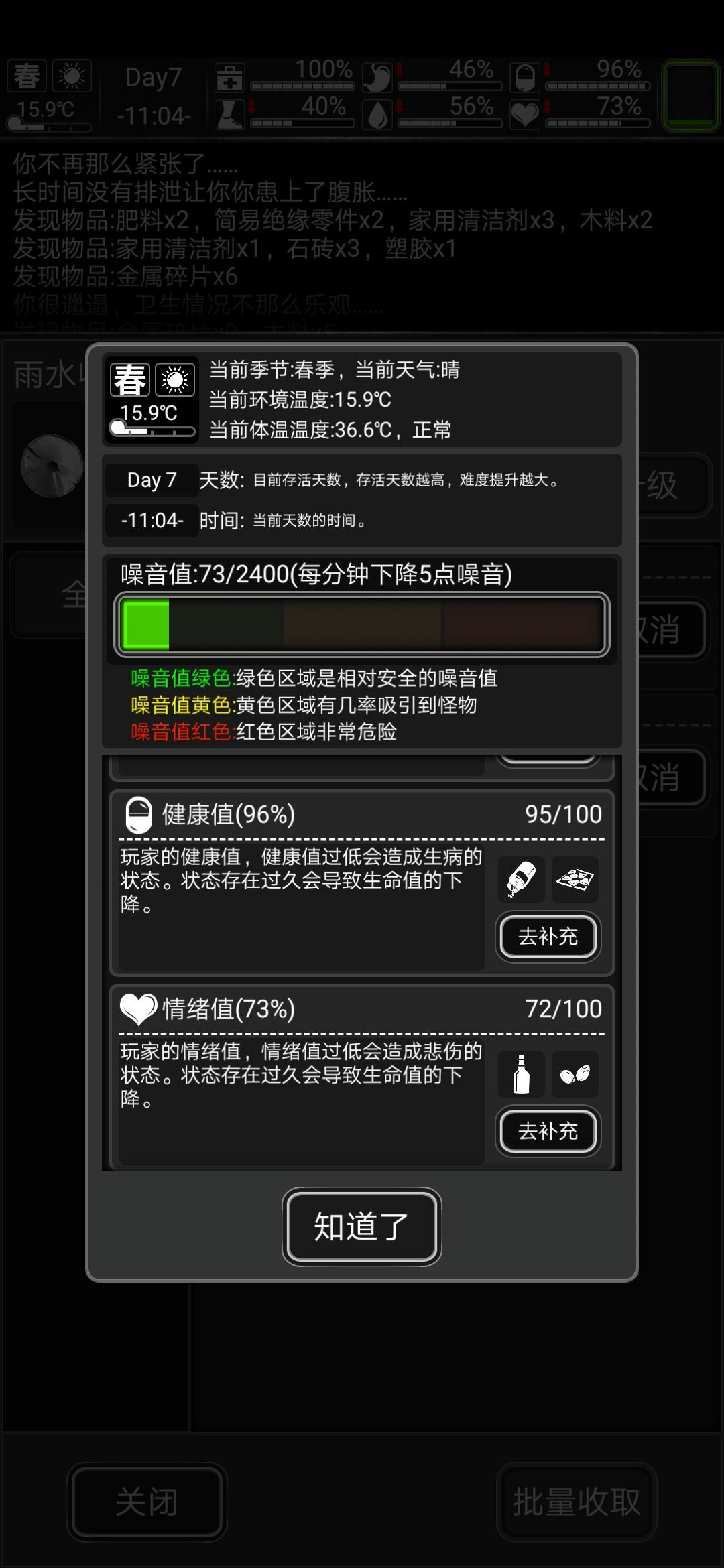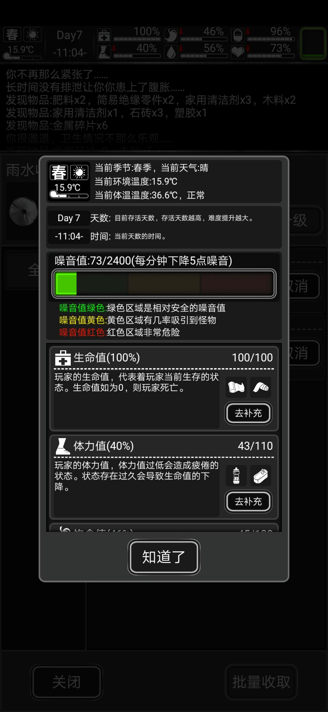 七值指噪音值,生存值,饱食值,水分值,健康值和情绪值后面六值与生存值息息相关。在游戏上方点开即可查看。各位看图就行。