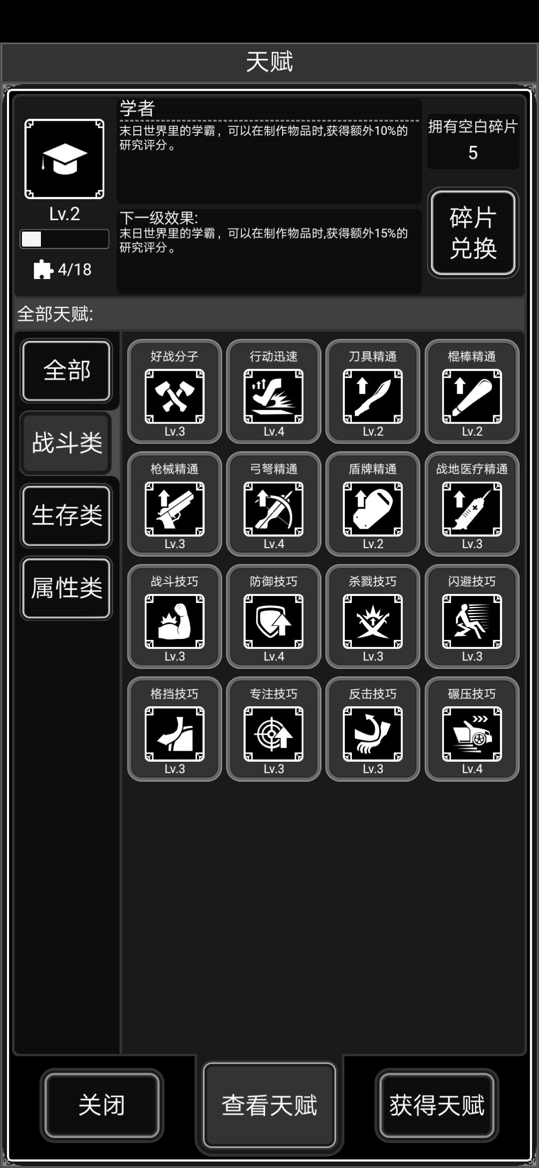 主要战斗天赋:战斗技巧,杀戮技巧,专注技巧,反击技巧,格挡技巧,闪避技巧,行动迅速,枪械棍棒弓弩刀具精通