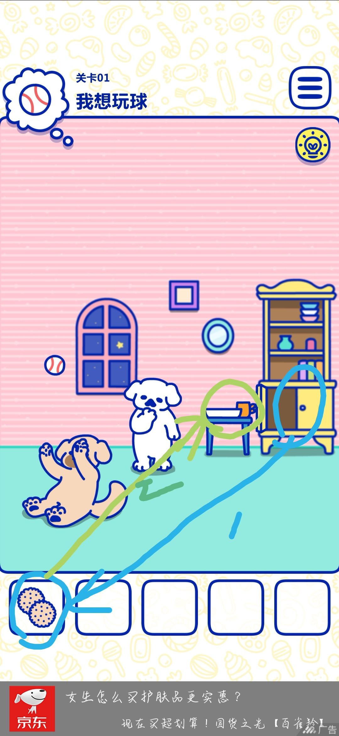 1.从柜子里拿出来饼干,然后放在碗里,小棕狗就会去吃,然后拿球就行