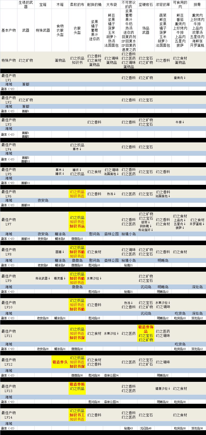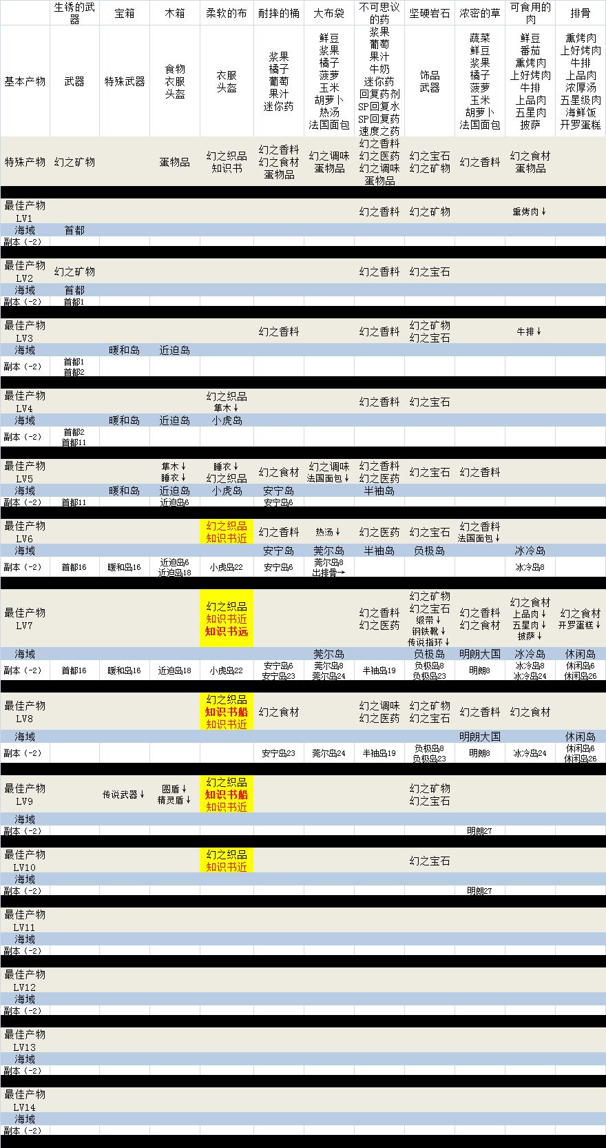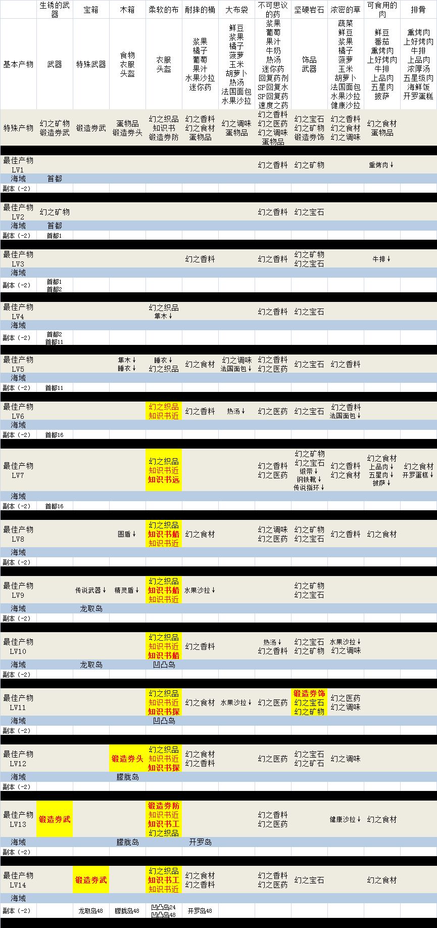 下面是数据表,海域指挂海产出。副本的数字指花费的体力值,已经两冒险家-2了。